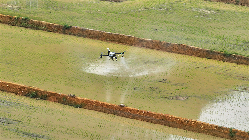 無人機(jī)正在播灑肥料。新華網(wǎng)發(fā)(牙舉成 攝)