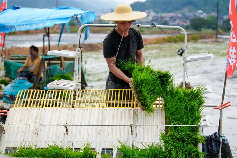 農(nóng)民把秧苗放到插秧機(jī)上,準(zhǔn)備插秧。新華網(wǎng)發(fā)(盤斌 攝)